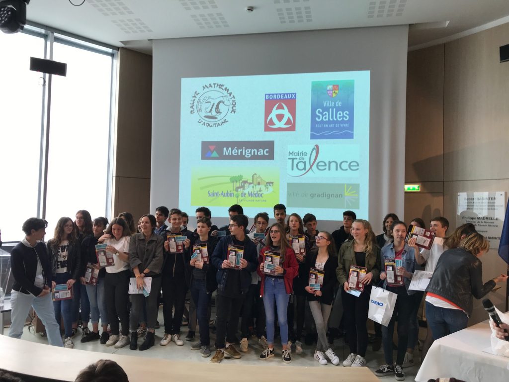 La remise des trophées pour le Rallye Mathématiques d’Aquitaine s’est très bien passée. Les élèves ont été accueillis au conseil départemental avec des viennoiseries/jus de fruit/café/thé. Les 4 classes de troisièmes, les 3 classes de seconde générales et technologiques et 1 classe de seconde professionnel se sont regroupées dans un amphi et ont été appelées les unes après les autres pour être récompensées.