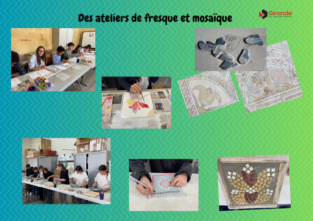 Les couleurs des fresques proviennent de terre, réduite en poudre, mélangée à de l’eau et posée sur des murs recouverts de mortier lissé. C’est la technique de l’enduit peint. Sept couches d’enduit sont conseillées, mais à Plassac, il n’y en a que trois. L’après-midi, ils ont visité le site : la villa et le musée. Ils sont repartis à Salles avec leur production.